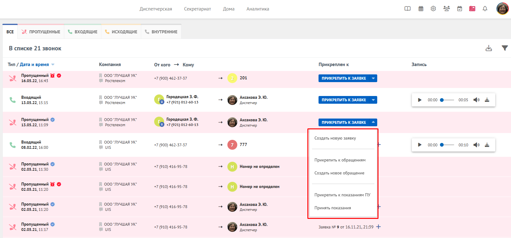 Чтобы прикрепить звонок к существующей заявке, нажмите на кнопку Прикрепить к заявке. Чтобы прикрепить звонок к обращению или показаниям ПУ, или создать на основании звонка новую заявку, обращение или принять показания нажмите на стрелку вниз рядом с кнопкой Прикрепить к заявке и из выпадающего списка выберите нужную команду.