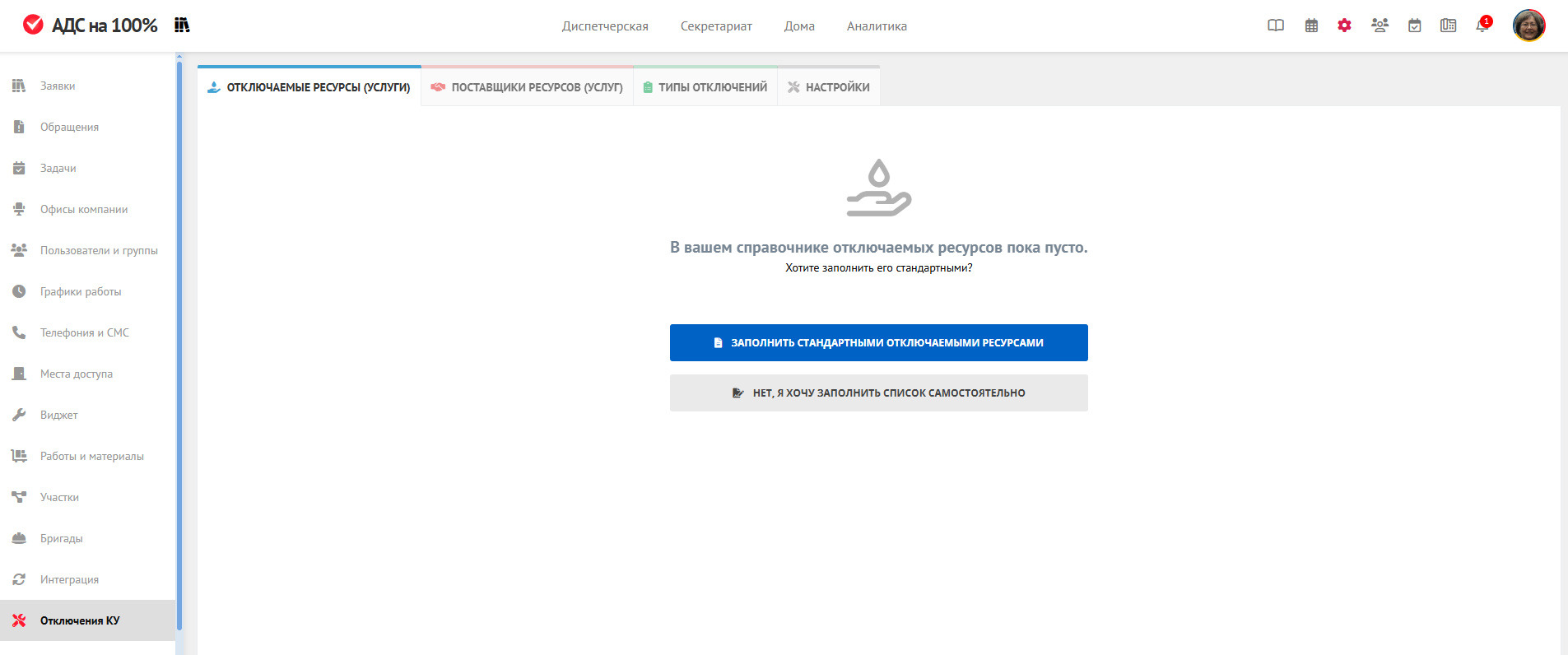 В Настройках (Отключение КУ), в подразделе Отключаемые ресурсы (услуги) создайте основу для работы - добавьте стандартные отключаемые ресурсы (кнопка Заполнить стандартными отключаемыми ресурсами). При необходимости заполняйте список отключаемых ресурсов самостоятельно (кнопка Нет, я хочу заполнить список самостоятельно).
