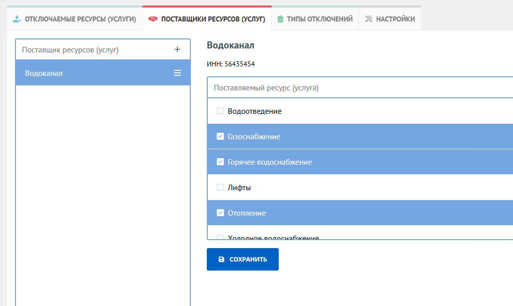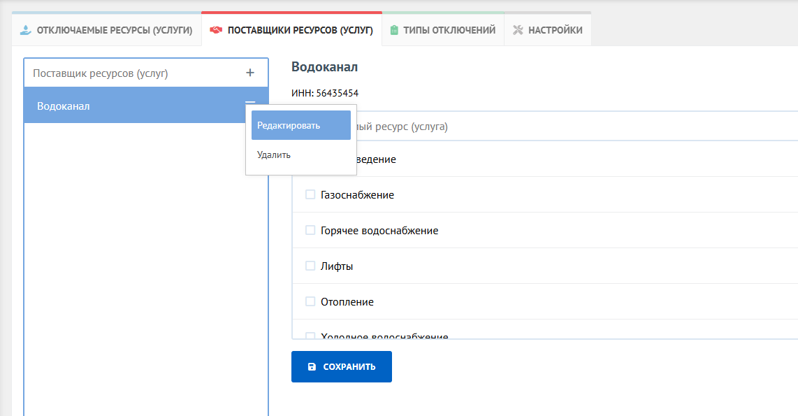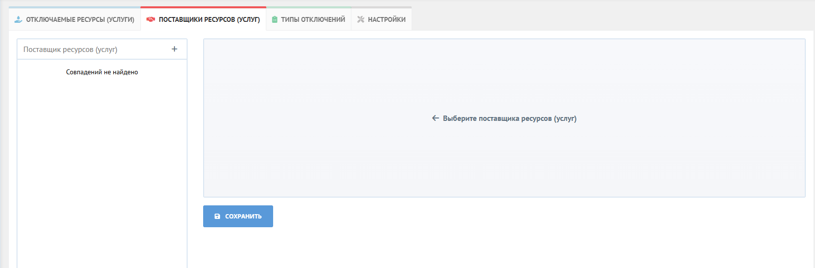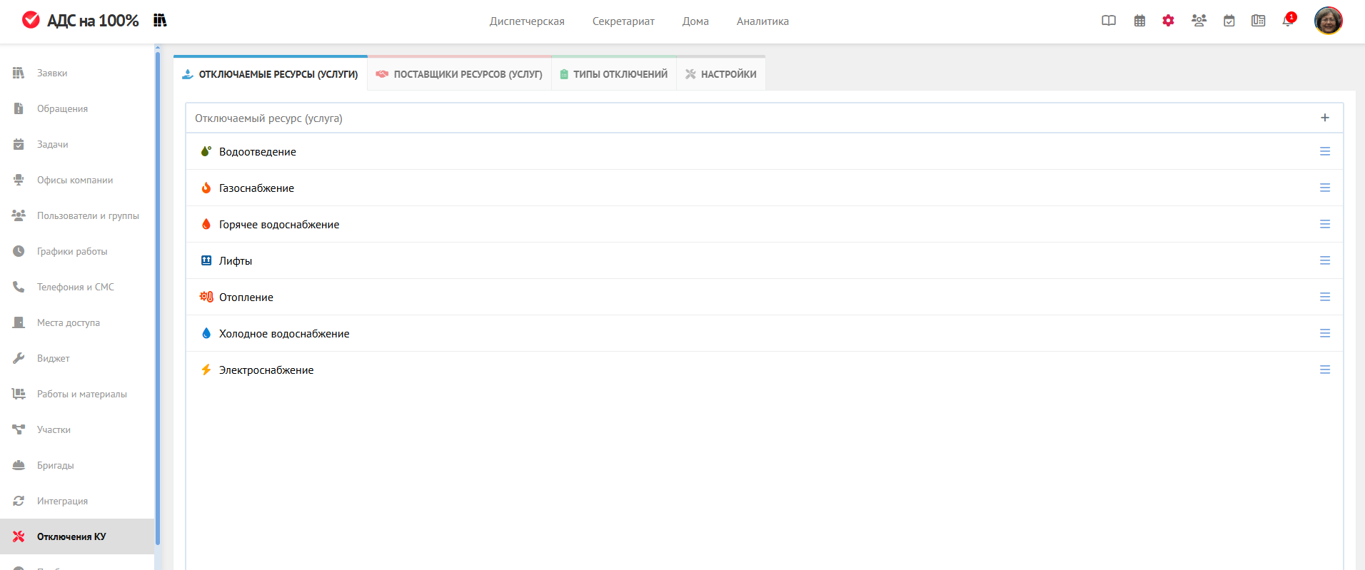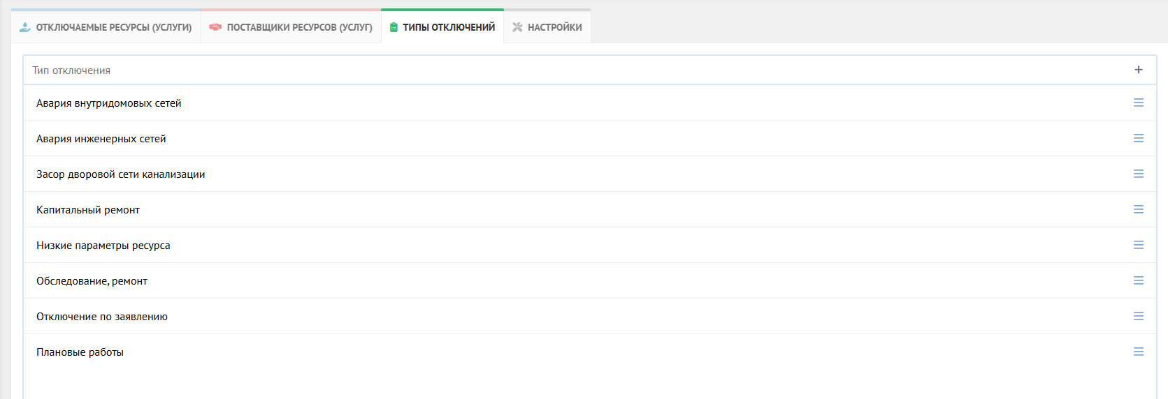 Здесь в подразделах Отключаемые ресурсы (услуги), Поставщики ресурсов (услуг), Типы отключений происходит подготовка для создания задачи по отключению того или иного ресурса в доме.