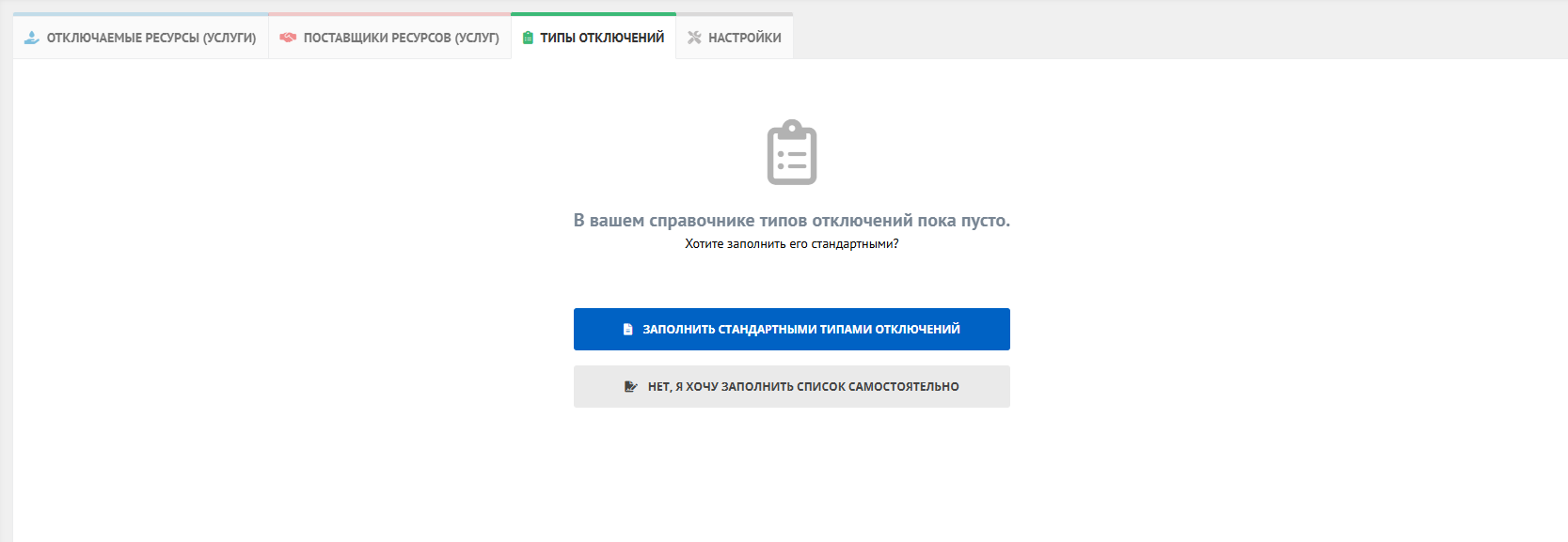 В подразделе Типы отключений добавляйте стандартные типы отключений (кнопка Заполнить стандартными типами отключений)или заполняйте список самостоятельно (кнопка Нет, я хочу заполнить список самостоятельно).