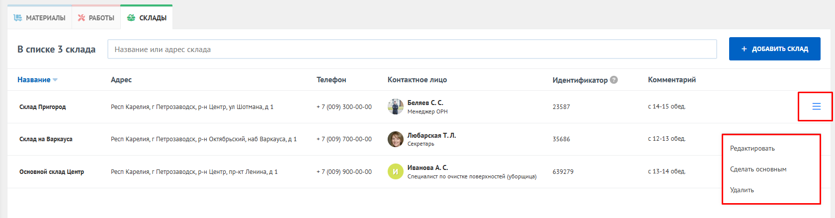 Для удаления или редактирования информации нажмите кнопку редактирования справа в строке с нужным складом (три полоски).